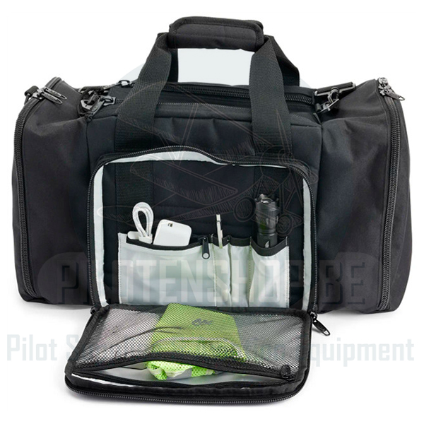 The large, central pocket at the heart of the Flight Bag has adjustable dividers that allow for customized configurations, both lengthwise and crosswise, depending on your specific needs. Zippered pockets on both ends of the bag are now larger and ideal for most aviation headsets. They can also be used to carry other items like a tablet, book, or a small binder. The zippered compartment on the front of the bag is ideal for smaller items and includes pockets for a flashlight and fuel tester, a smaller zippered ID pocket for your certificate, a lanyard for keys, and a large mesh pocket to keep loose items contained. On the back of the bag is an open pocket that doubles as a sleeve to slip over a roller bag for easy transport.